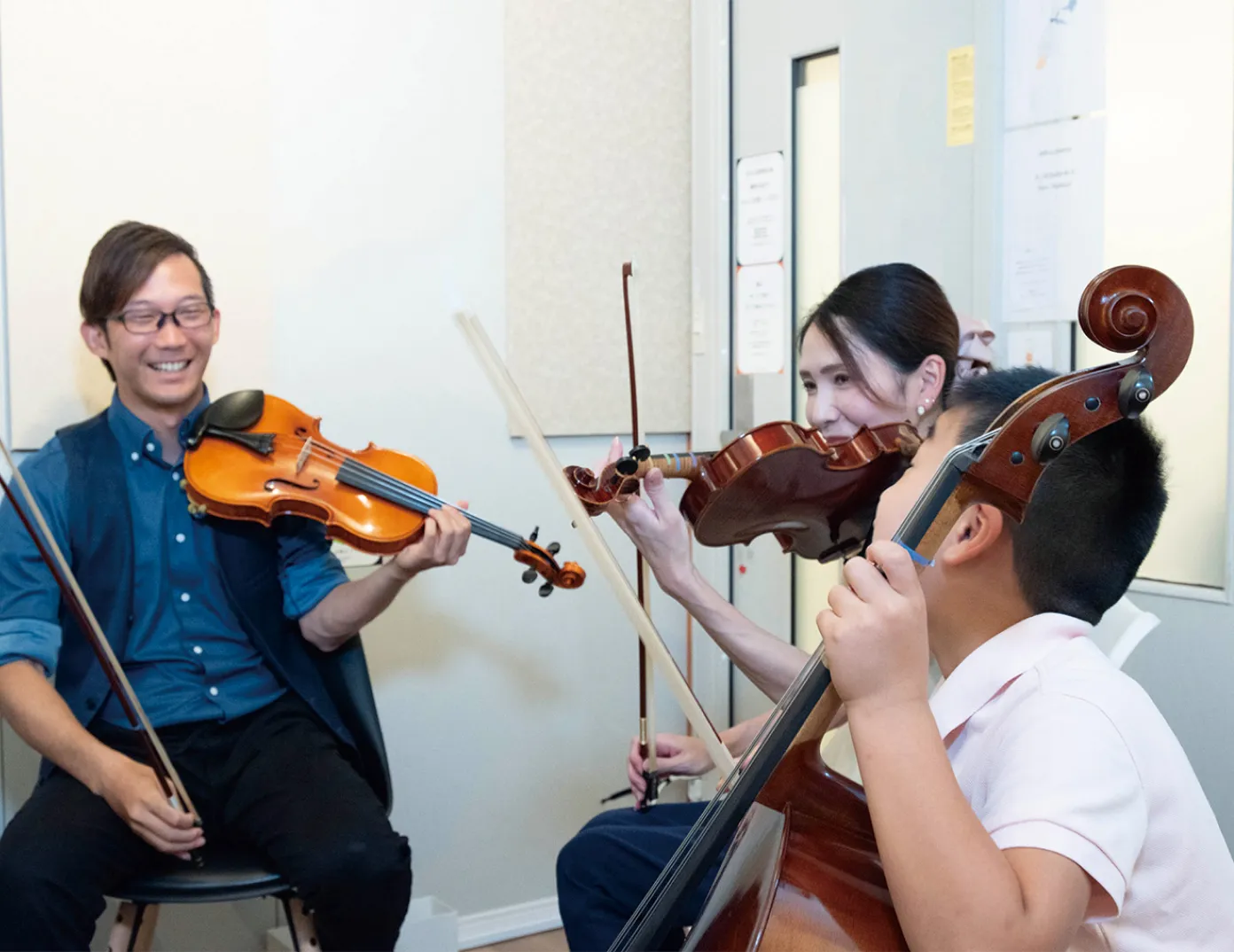必要ではございませんが、ご同席を強くおすすめしています。親子で一緒に弦楽器を知っていただくことで、お子様の成長する姿もご覧いただけます。保護者様が楽器のことをご存知でない場合、お子様に練習を任せっきりになりがち。できれば親子二人三脚で学んでいただきたいというのが僕たちの想いです。保護者様に楽器をお貸しして、子供たちと一緒に演奏することもあるのですが、みなさんとても楽しそうですよ!一緒に歩んでいただくことで、10年後にできる思い出もより濃いものになると思います。